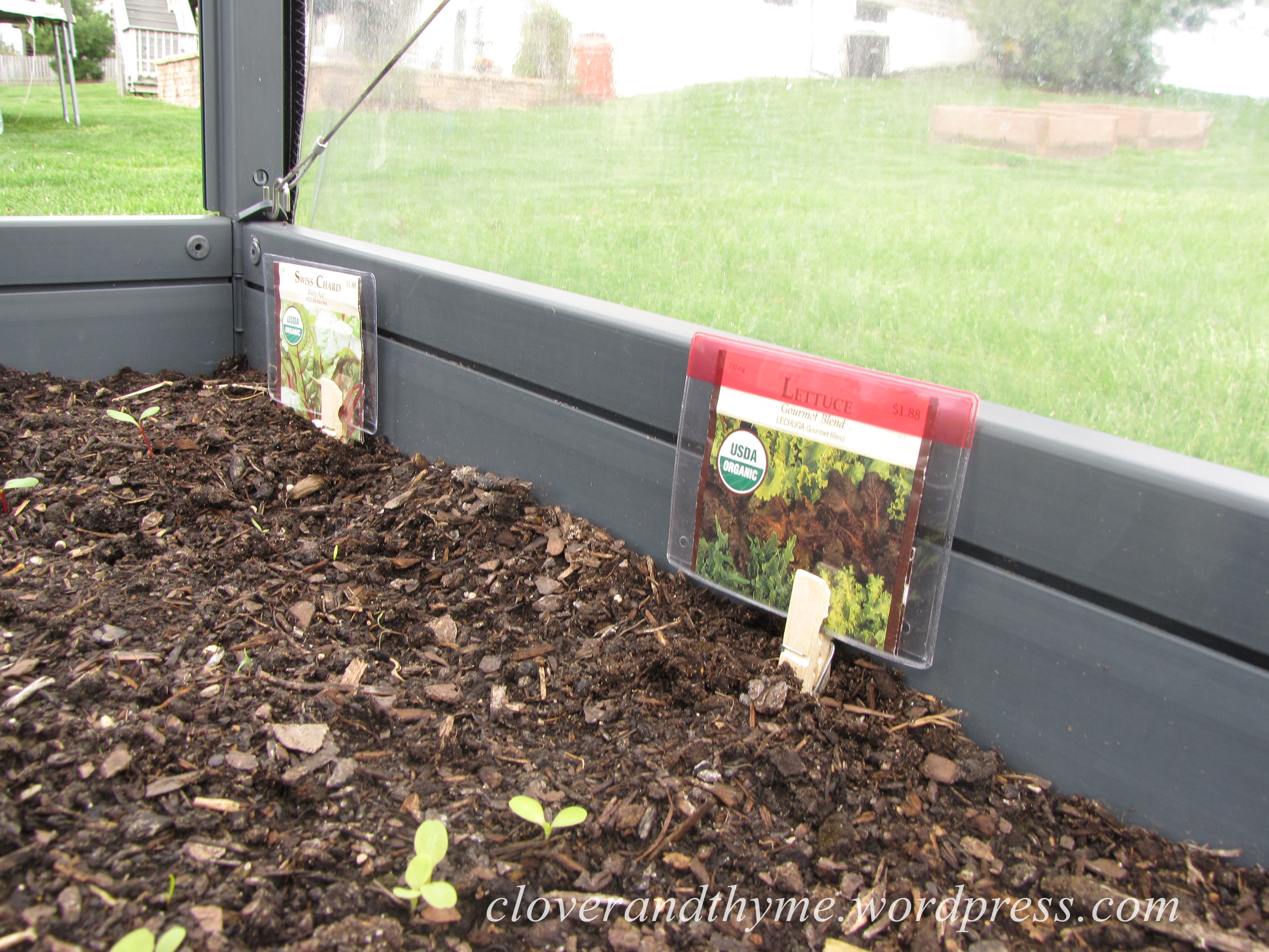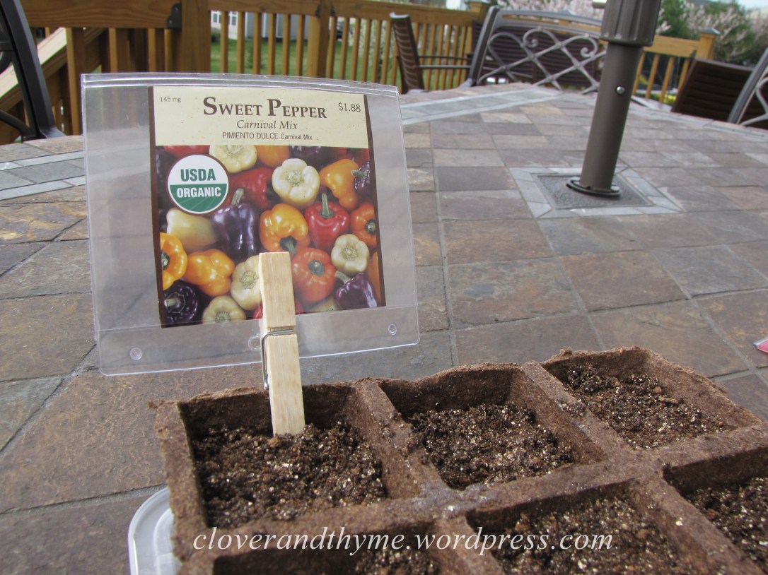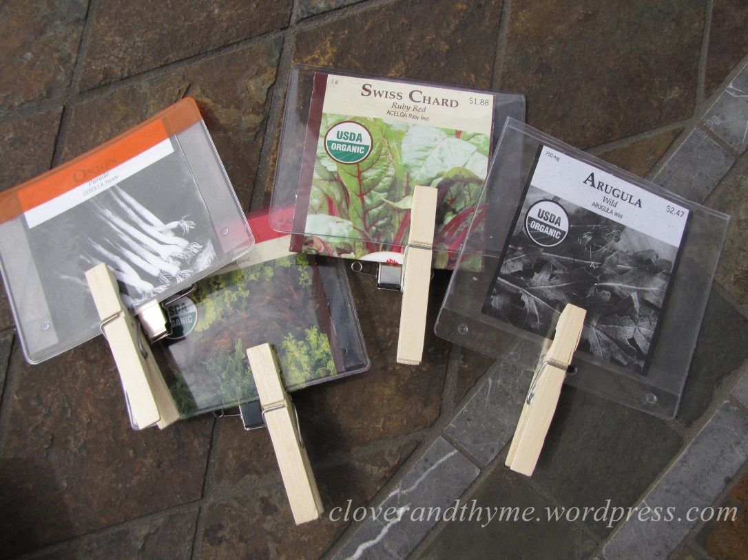 I simply removed the tags from their lanyards and slid the front of the seed packets into the pocket. With the opening of the name tag facing down, I clipped the clothespin to the tag. For the packets that still had seeds in them, I ran off a copy of the front of the packet instead (Hubberman’s home office is helping out a lot with this project.) 🙂