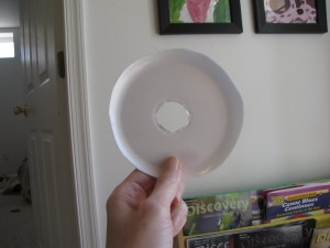 - Cut a 1 inch hole in the center of your plastic plate or lid and trim it to create a 4-5 inch disk with the hole in the center.