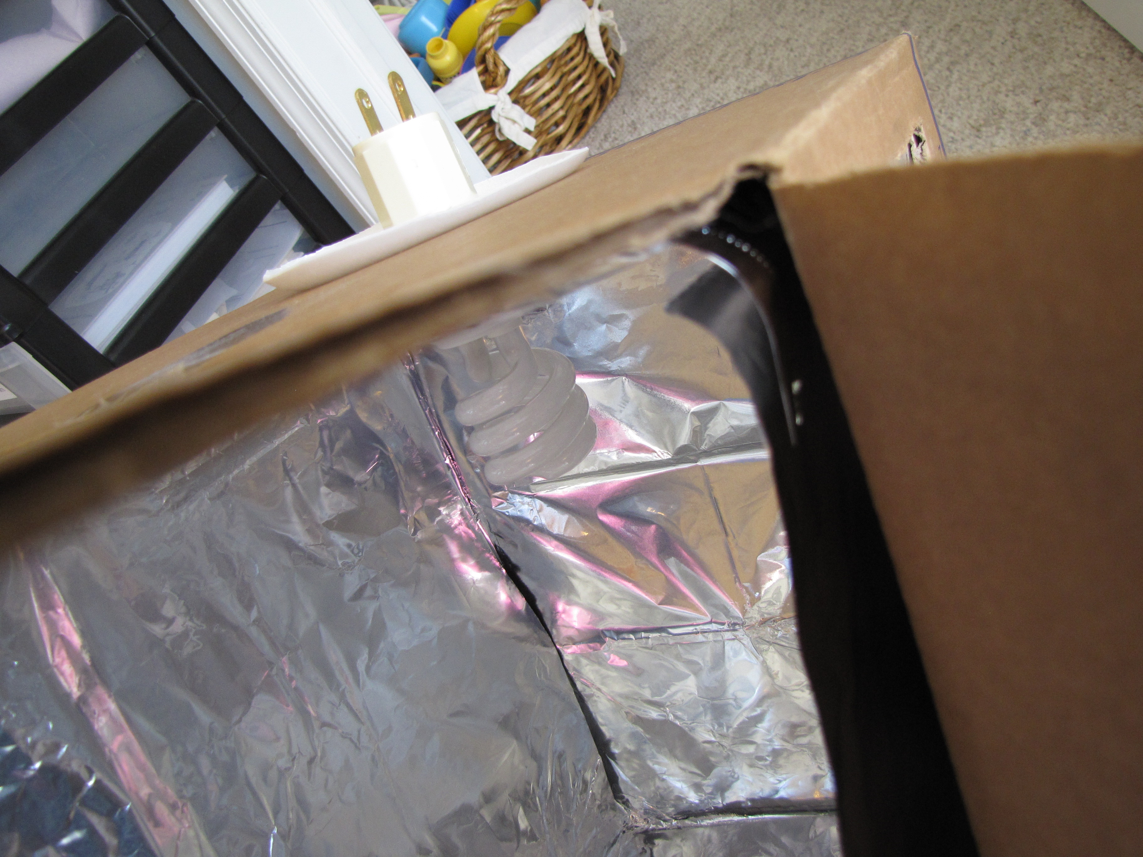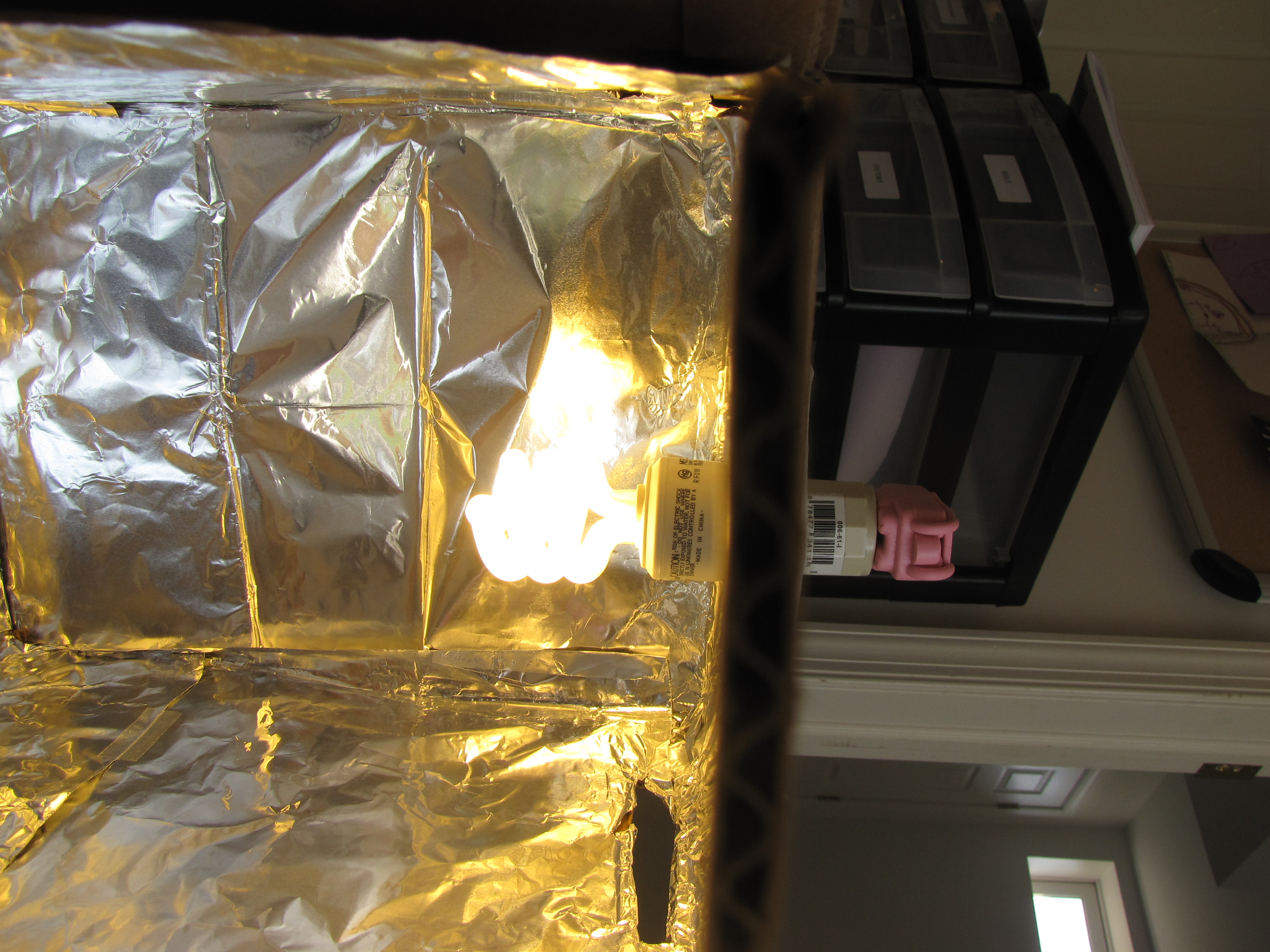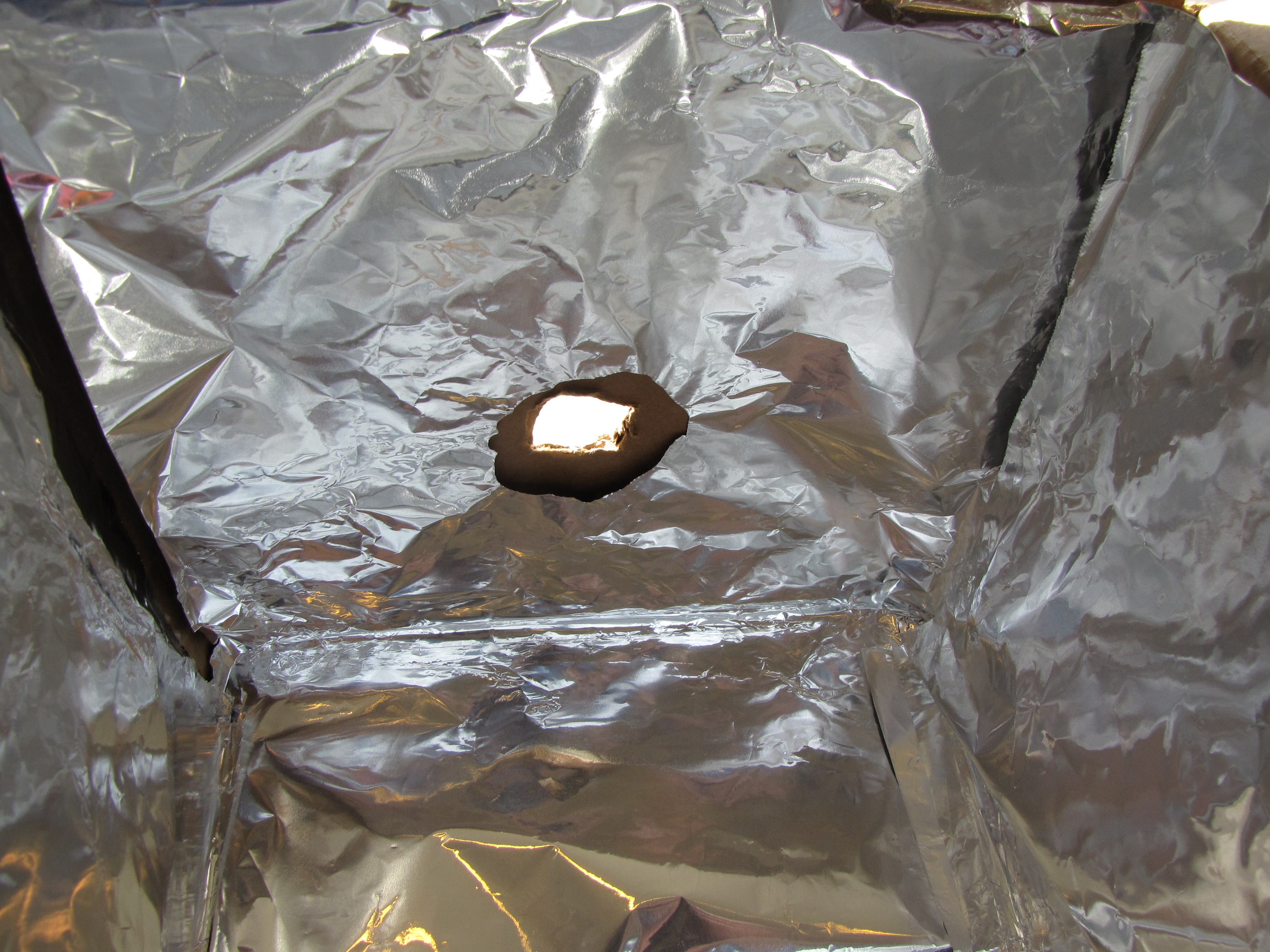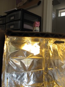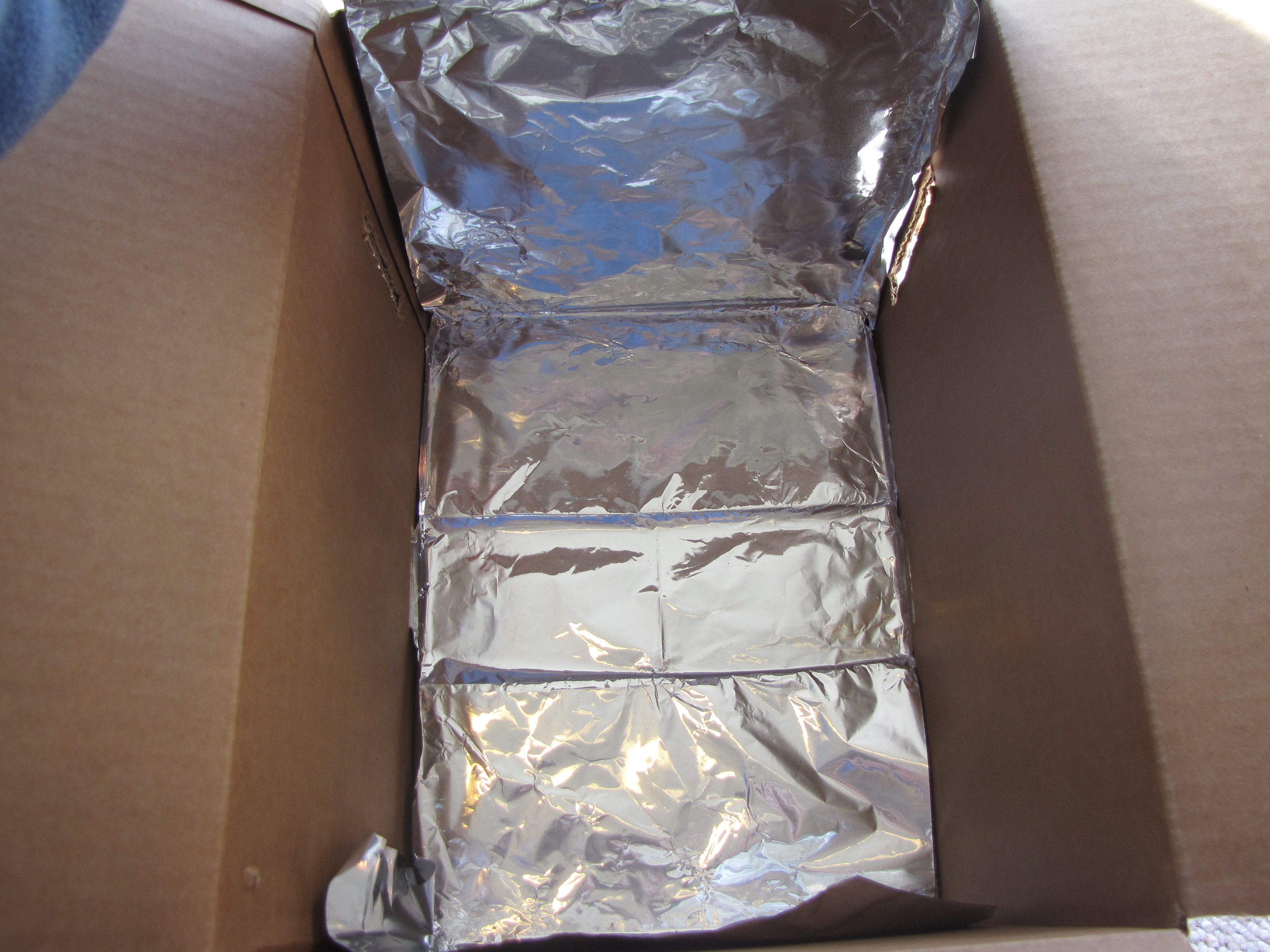 - Line the inside of your box with foil, covering all the sides (photo does not show all sides covered yet, obviously) using tape or glue to secure the foil in place.
