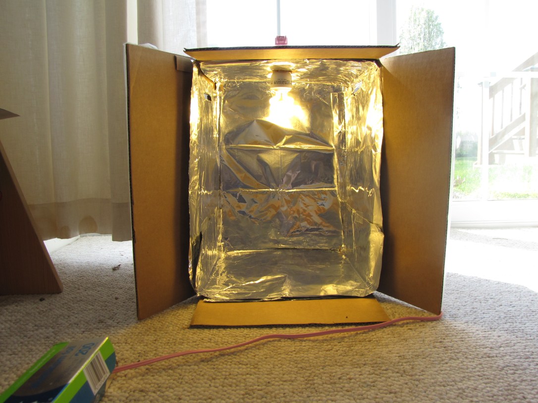 There you have it! Now, a little word of caution: I’m a bit of a freak when it comes to electricity, heat and paper products being in such close proximity to each other, so I am very diligent in checking my box to make sure it’s not getting too hot around the bulb or socket – and it never does. Even so, I never leave this on while I’m away from the house. Just sayin’.