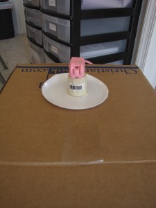 - Push the base of the light bulb through the hole in the top of the box and place the plate on the box so that the base of the bulb sticks through it as well. Then screw the socket onto the bulb. (I’m sorry I don’t have a better photo of this step, hopefully you get the idea from the photo below.)