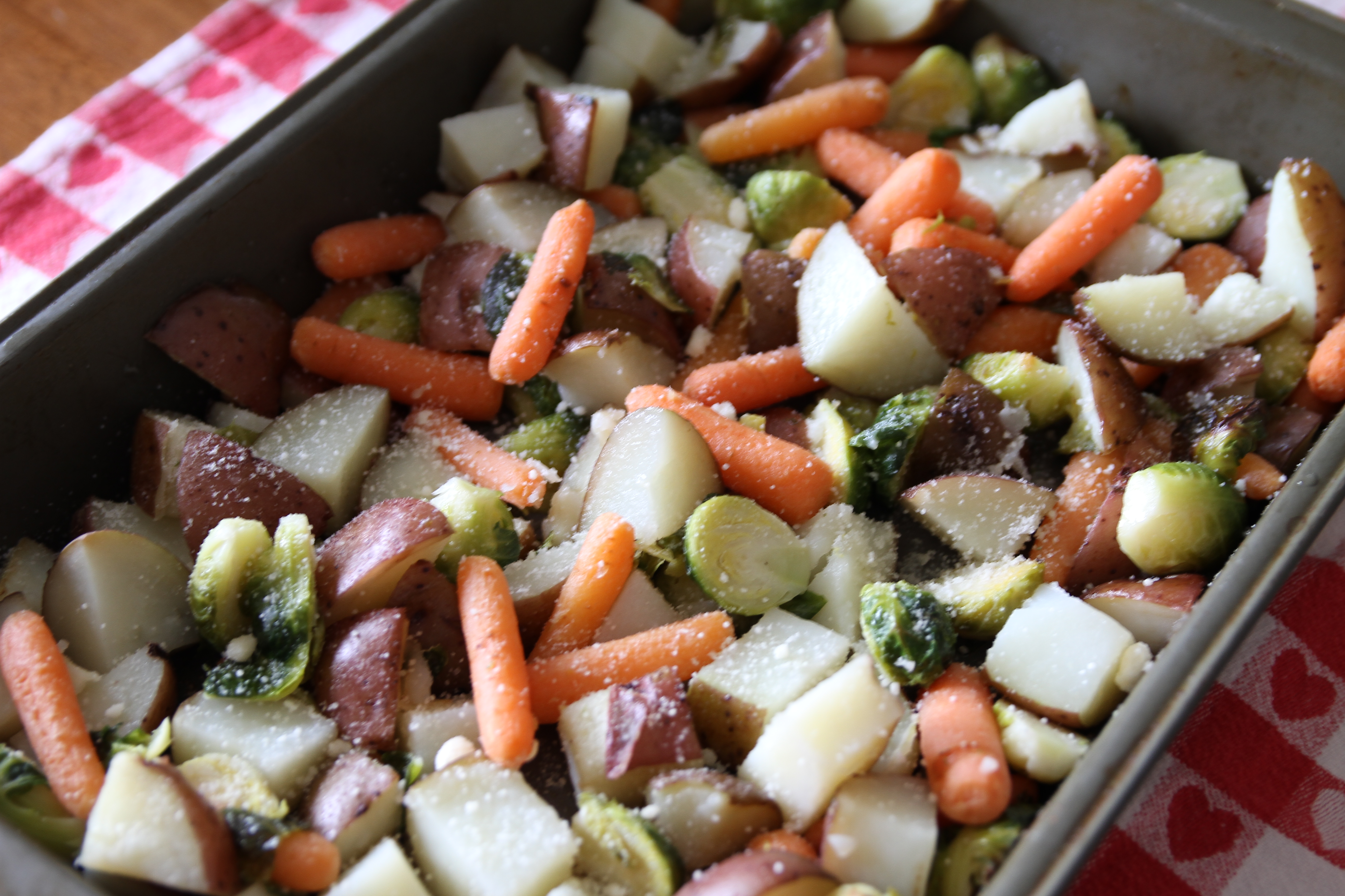 First, I just blanched the potatoes and carrots in boiling water for the length of time that it took me to rinse and trim my brussels sprouts. Then I tossed the sprouts in the water for the very last few minutes of boiling time (about 2-3 more minutes, tops.) Then, I drained the veggies and moved them to a roasting pan, dabbed them with a little butter and popped them in the oven for about 30 minutes at 350. Once they were fork tender, I took them out, tossed them around a bit, and added just a sprinkle of white balsamic vinegar and a healthy dose of parmesan. Back in the oven for a few minutes, and then done! I’m making these again on Sunday. Can’t wait!