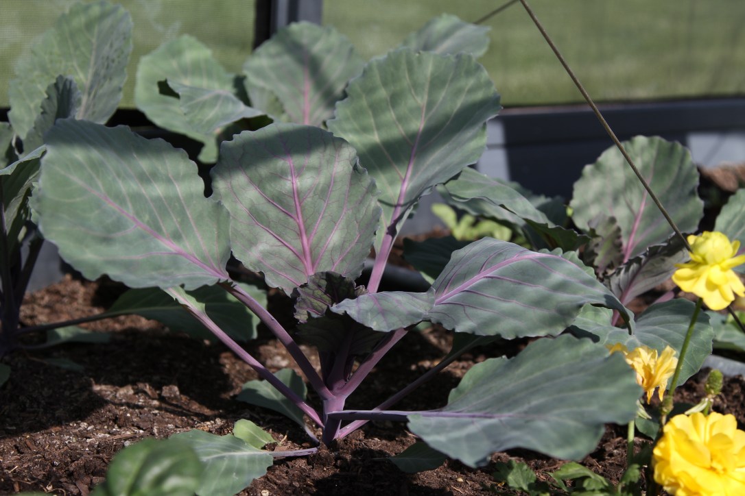 The red cabbage seem happy and bug free. The yellow flowers are the ranunculus I planted to lure the aphids. Ironically, I see no aphids on them. They’re pretty, though, either way.
