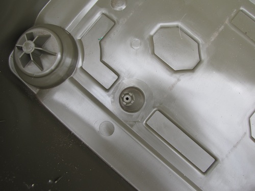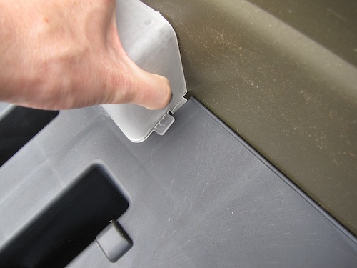 Next, you’ll place the black tray back in the container and then install the inside piece for the watering drawer. One little tab goes over the tray, and one under on each side, as shown above.