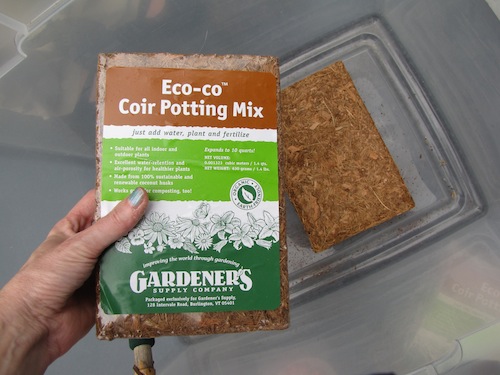 This was the fun part – the coir potting mix! Open up your bricks and place them in the big container. Add the instructed amount of water and wait until the bricks absorb the water and expand.