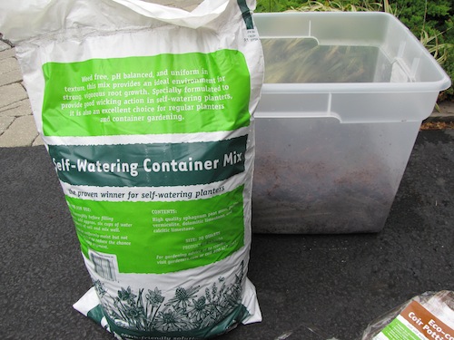 You will definitely need a large container (or wheel barrow, or something) for mixing the soil. It will be too crowded to mix it in the container itself. Here’s what I used: