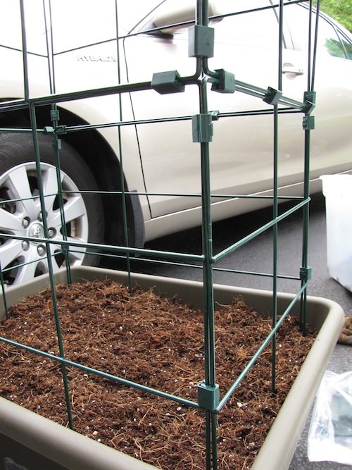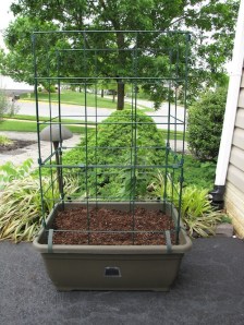 That’s it! Also available are casters and a cage extension, though I do not have either yet. The instructions indicate that this planter can accommodate two large determinant tomato plants. Ever the optimist (or maybe I’m just naive) I placed two indeterminant plants in it. So I think I have a cage extension in my future.