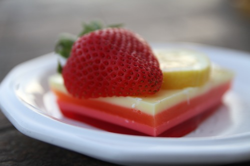 My daughter and I were so enamored with this little layered jello concoction we decided to recreate it back at home using our host’s recipe (she had a little cookbook available for sale – I don’t think I’ve ever pounced on a cookbook faster.) After tossing around jello flavor ideas we decided on strawberry and lemon flavors. Here’s our version!