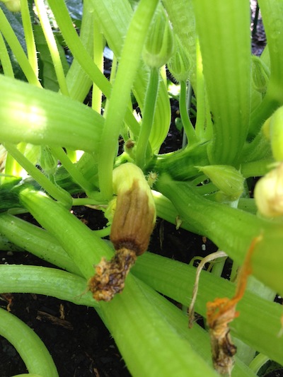 If I’m not mistaken, this is blossom end rot. It’s quite a bummer, because these squash were looking really good so far. I have a feeling this has to do with soil depletion (specifically calcium) where I planted them. I’ve been a bit cavalier about where I’ve planted things, not really heeding any soil prep guidelines. Seems I’m paying the price for placing my squash in already depleted soil.