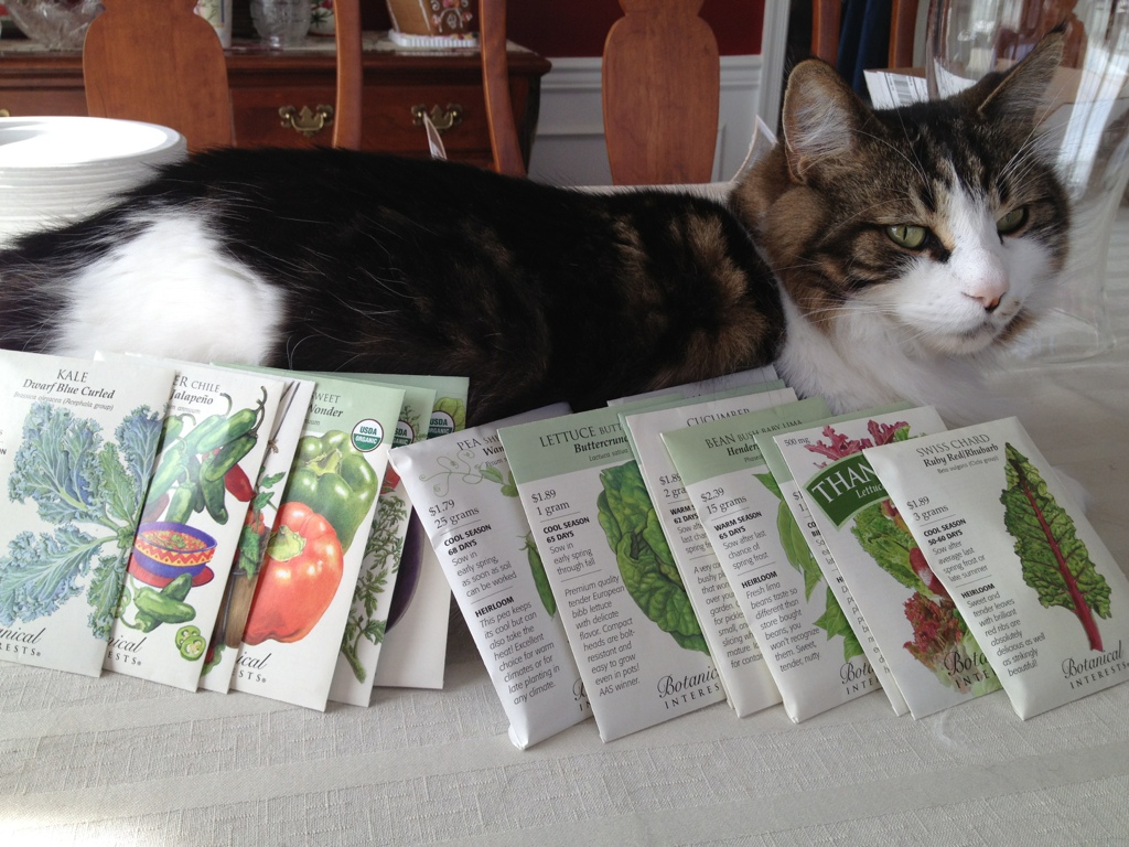 My seeds came on Monday! The cat, however, is not a recent arrival. He just makes the photo more interesting and helps prop up the seed packets. Notice how pleased he is with me.