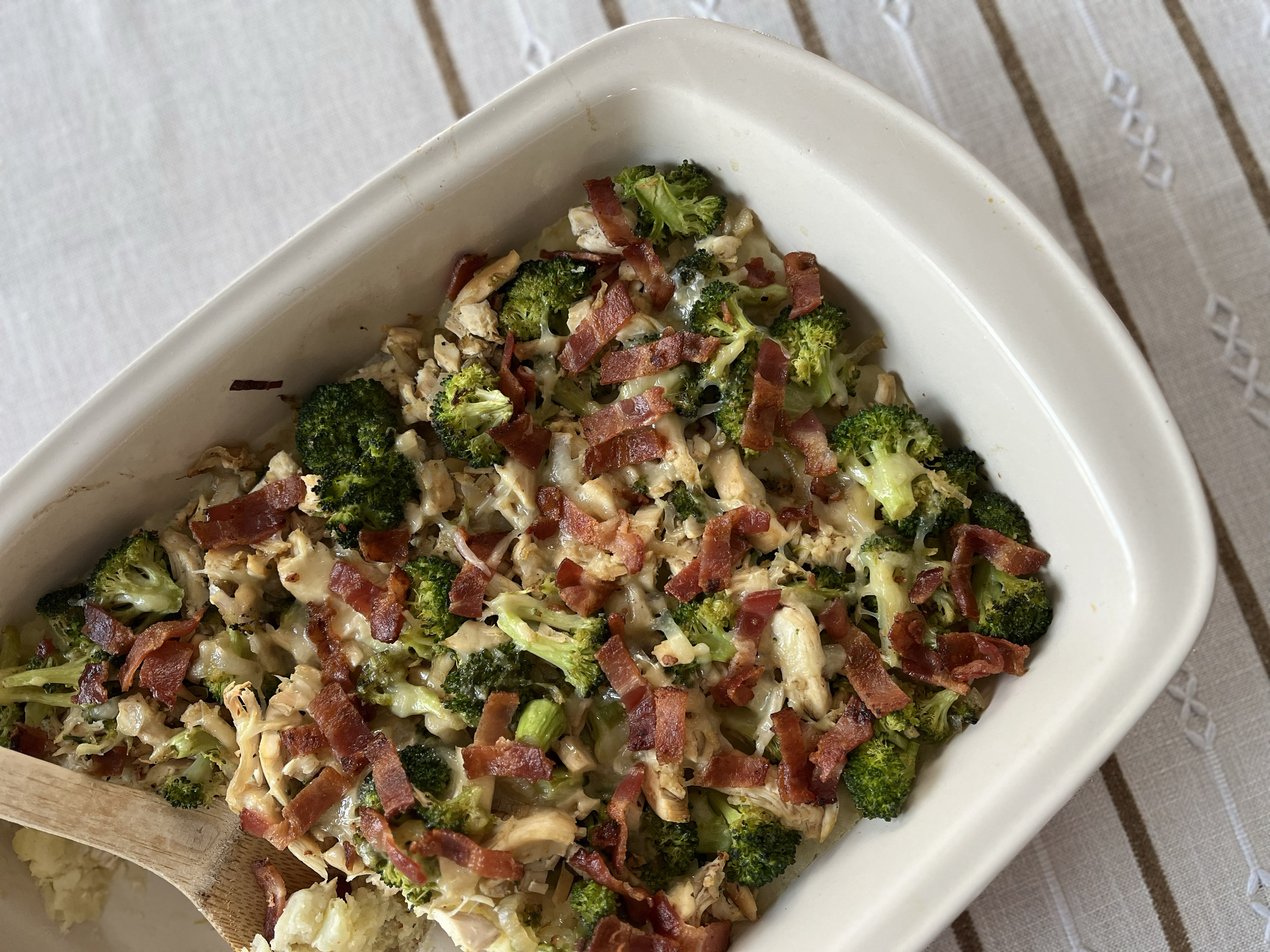 - Assemble Casserole: – Transfer potato mixture to a greased 9×13 inch casserole dish. – Layer cubed chicken over the potatoes. – Spread the broccoli and shallot mixture over the chicken. – Top with remaining cheddar cheese and chopped bacon.