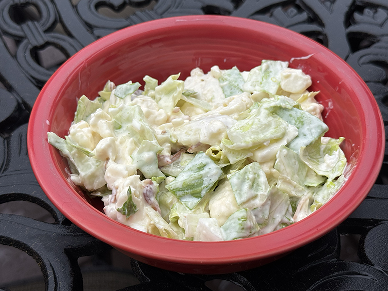 I found this Lettuce Bacon (and cauliflower!) Salad in an Amish cookbook. It’s a classic for a reason, bringing together crisp lettuce, savory bacon, and a wonderfully creamy, slightly sweet dressing that ties it all together. This salad is perfect for a potluck, a family gathering (it’s definitely a “special occasion” salad given its fat content,) or a make-ahead meal that gets even better after a night in the fridge.
